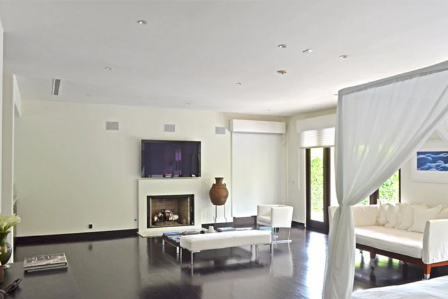 At the heart of the residence is a state-of-the-art chef’s kitchen with Carrera marble countertops, a Viking range, Sub-Zero refrigeration, and a built-in espresso center. A full wall of approximately 10-foot glass doors opens to true Southern California indoor-outdoor living with outdoor lounge and dining areas, a fireplace, and resort-style grounds.