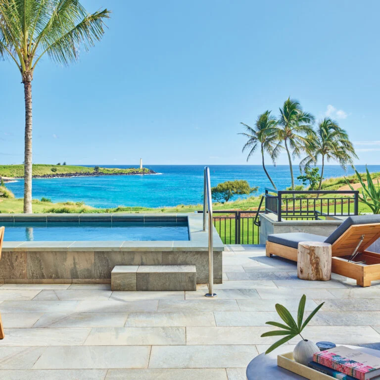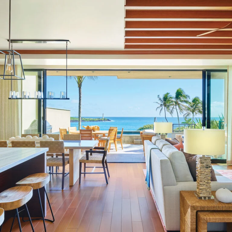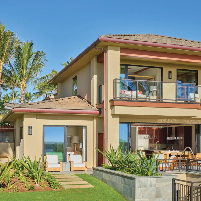 Lāola luxury townhomes offer more than 4,000 square feet of refined living, created to celebrate authentic indoor-outdoor Hawaiian lifestyle. These two-level residences sit just above the 15th fairway of the Ocean Course, with sweeping Pacific views. Look east and west for postcard vistas of the historic Ninini Point Lighthouse and the dramatic Ha‘upu mountain range.