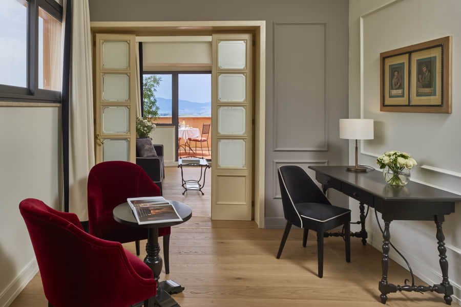 This elegant 50-square-metre suite, located in the hotel’s historic Belle Époque wing, is a refined tribute to the heritage of Grand Hotel Trieste & Victoria. Featuring bespoke furnishings, curated textiles, and precious period-inspired details, it offers a warm and sophisticated retreat with a separate living area for moments of relaxation. A private terrace overlooks the vibrant centre of Abano Terme, while the marble bathroom with his-and-hers sinks, walk-in shower, and large windows adds modern comfort, complemented by a bespoke welcome reserved for the hotel’s most distinguished guests.