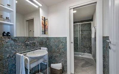 Pink Bedroom (approx. 18 sqm): Located at the end of the corridor on the left, also enjoying dual exposure and lake views. The bathroom features a large shower and single basin, with access to a small terrace shared with the adjacent sitting area.
