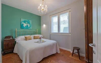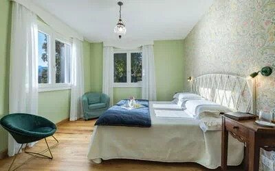 Green Bedroom (approx. 22 sqm): Positioned at the end of the corridor on the right, with windows on two sides and sweeping lake views. The bathroom is fitted with a bathtub and single basin.