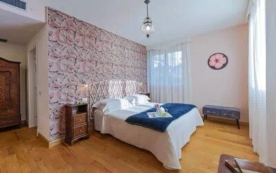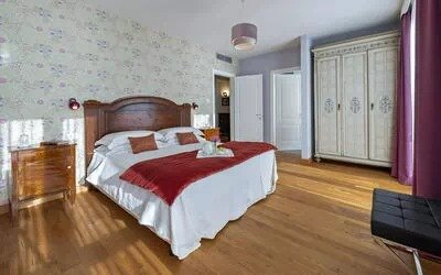 Villa Angela comfortably accommodates up to 12 guests, with the option to host 2 additional guests, across six double bedrooms, each with its own private bathroom. The villa also includes a separate staff bedroom with an en-suite bathroom, a bright and expansive living area, and an elegant dining room centered around an antique wooden table seating up to 18 guests.