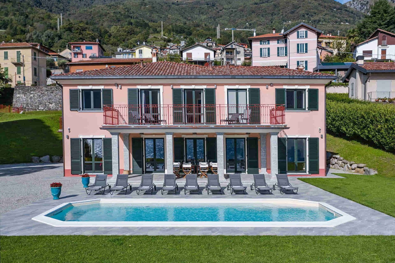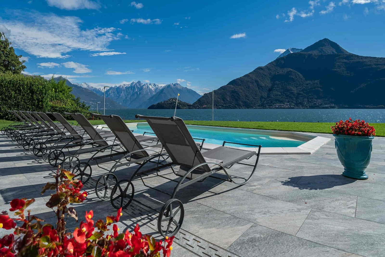 The estate offers private on-site parking, a heated swimming pool, a panoramic sun terrace, and a generous private garden that opens directly onto the lakeside promenade and beach.