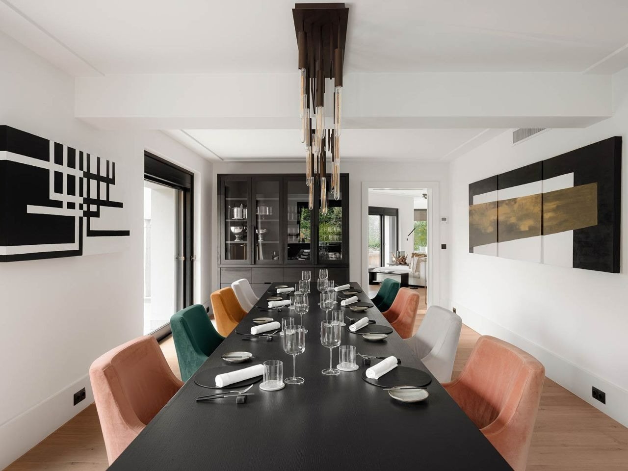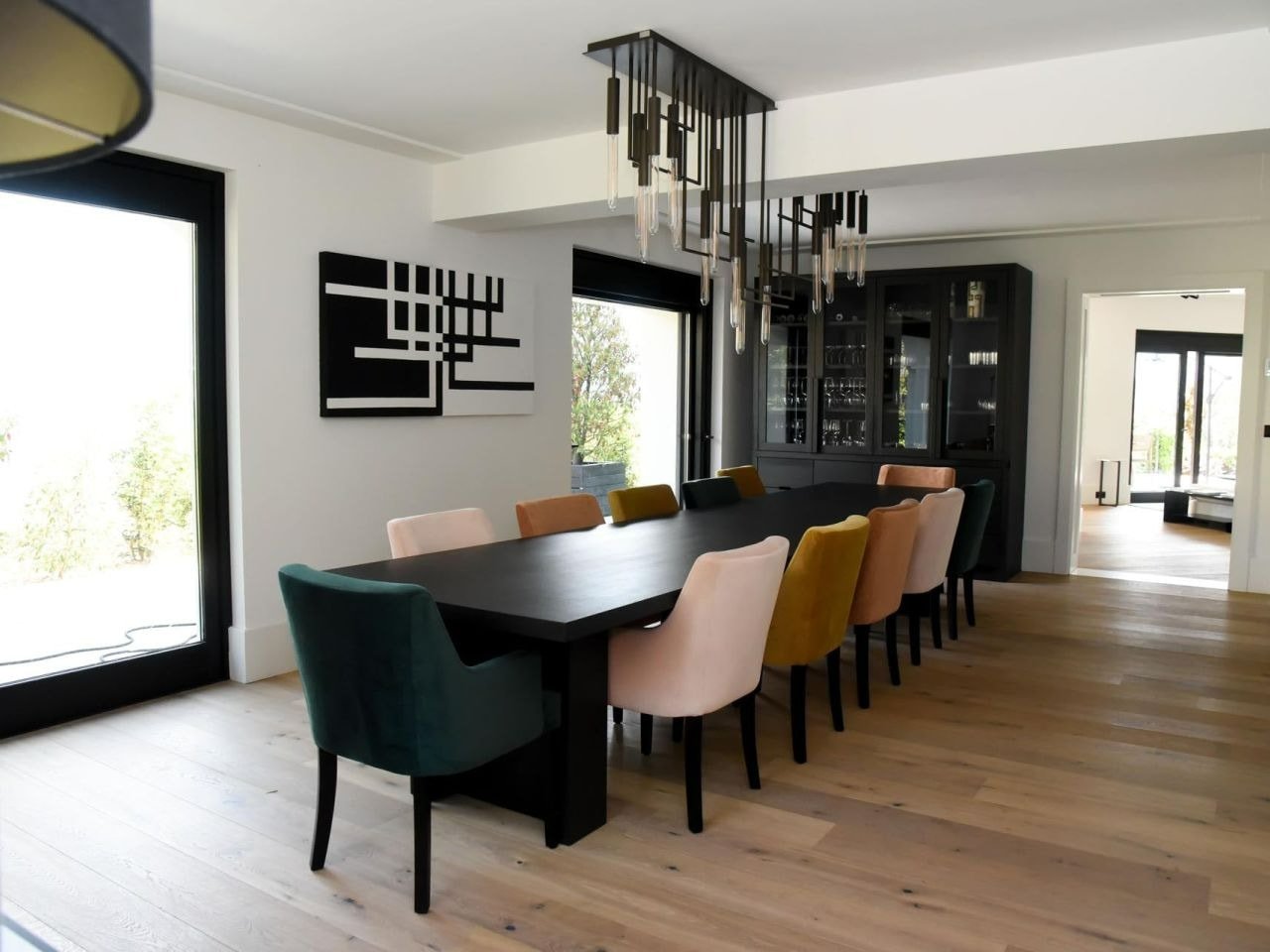 The first floor serves as the social heart of the villa, featuring a fully equipped modern kitchen and a grand dining area centered around an imperial table for twelve guests. This elegant space is ideal for hosting formal dinners or enjoying family-style meals prepared with local Italian ingredients. Adjacent to the dining area is a stylish living room that opens onto a spacious terrace, where guests can savor panoramic lake views while sharing a drink or conversation in the fresh evening air.