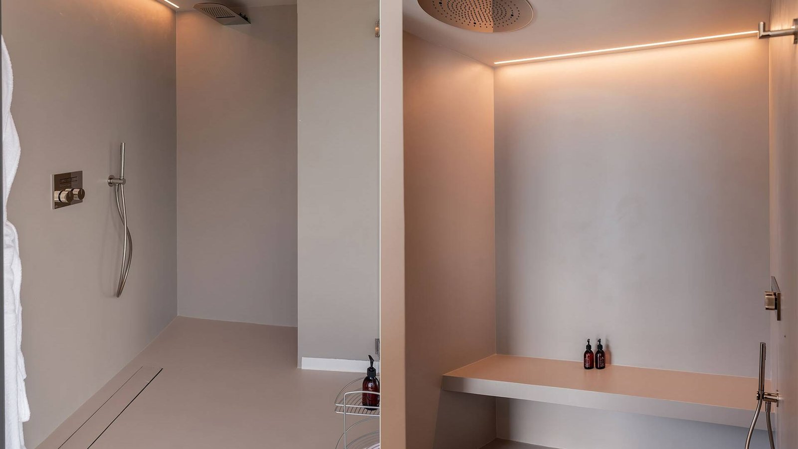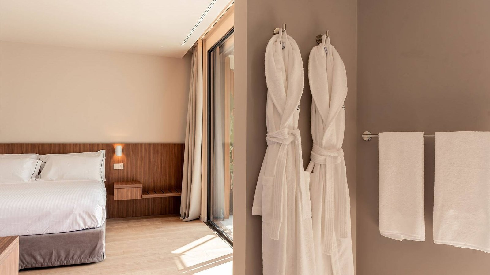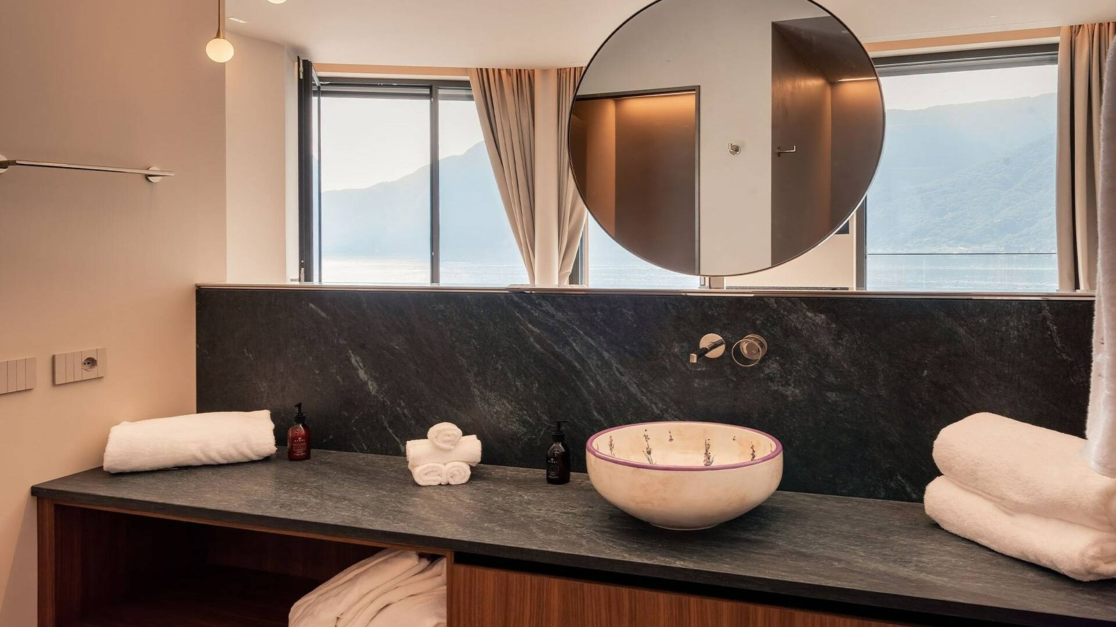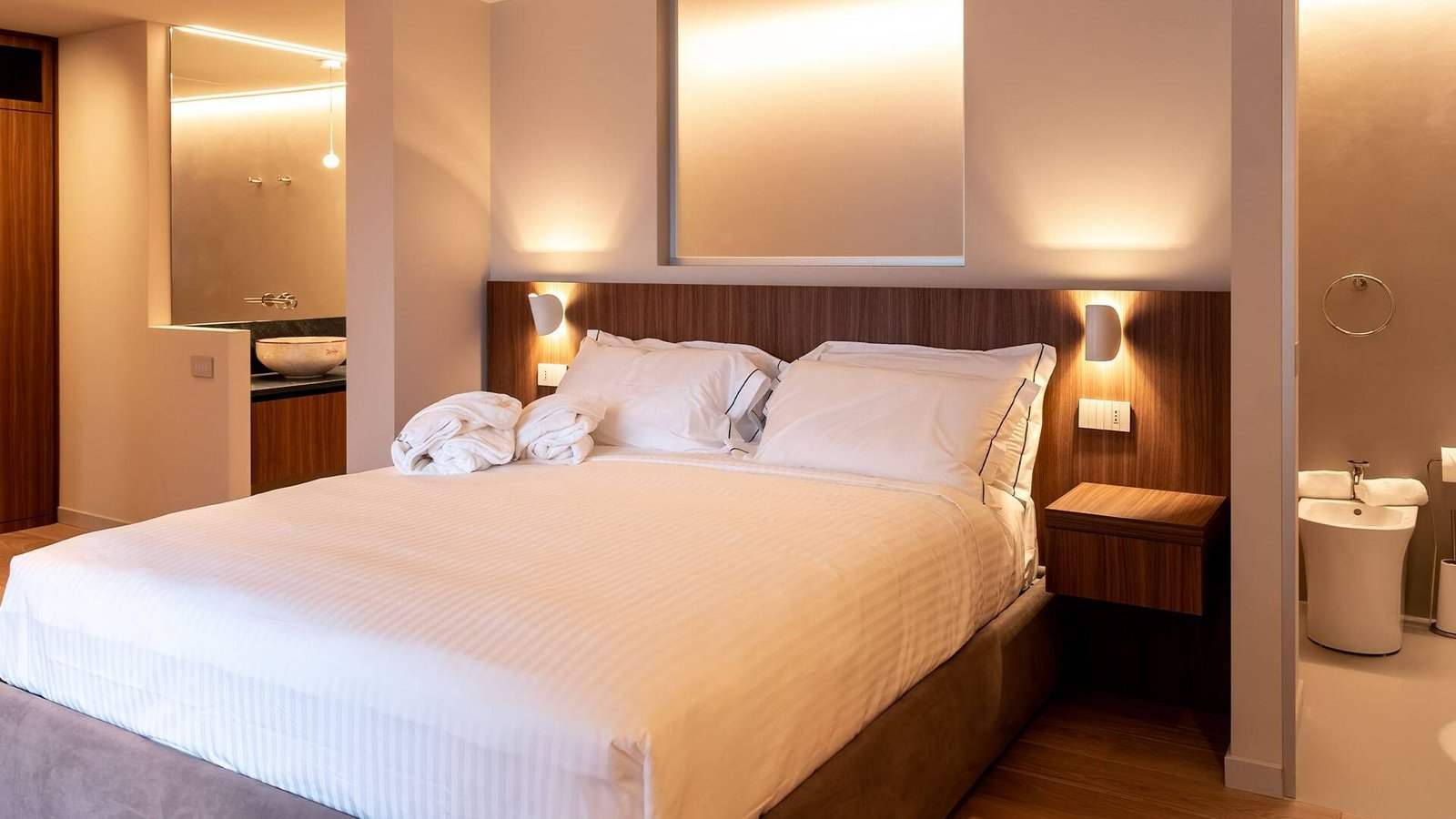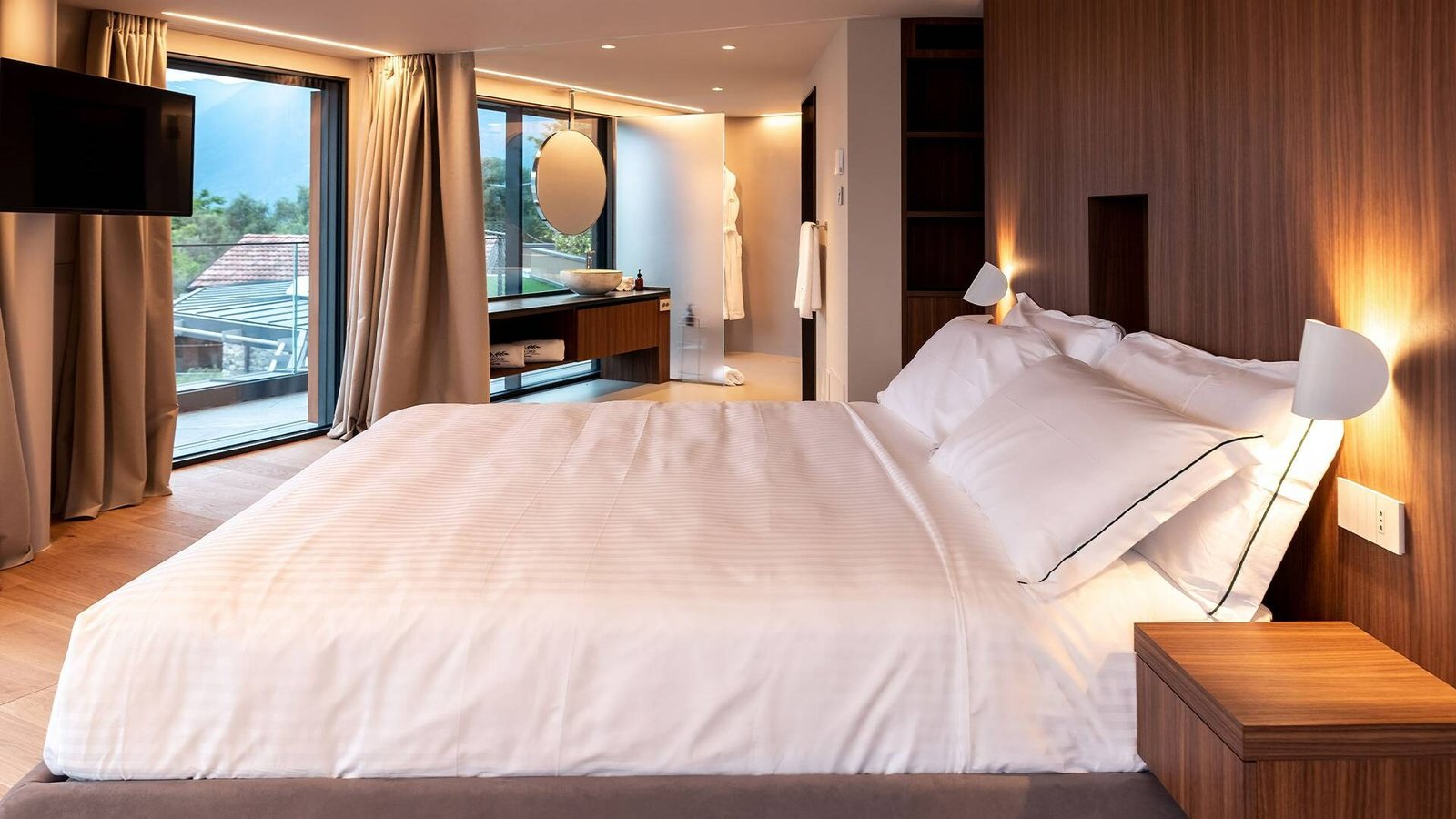 bedroom 1 double bed (not convertible into a twin, bed size 180x200cm, 71x79inch) with TV and direct access to terrace with lake view, en suite bathroom with walk-in shower (plus extra handheld shower).