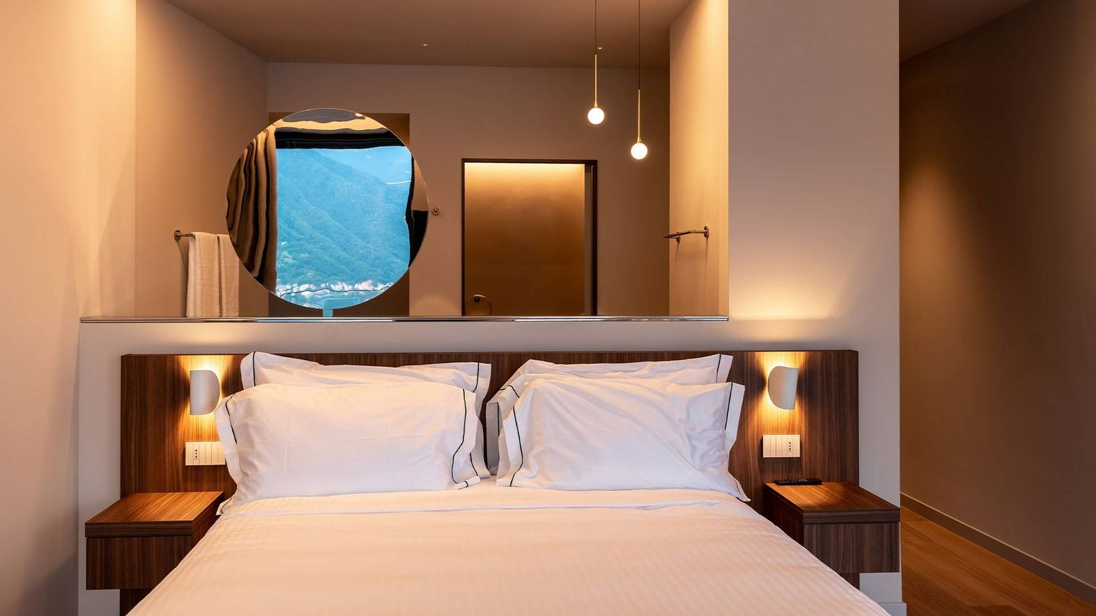 Outdoors, the villa’s geometric infinity pool seemingly merges with the lake, offering a swimming experience that feels like floating on water. Relax on the sunbathing deck, where modern deckchairs await, or unwind in the chic outdoor lounge area. Geometric shapes add a touch of contemporary artistry to the outdoors, enhanced by an external shower and a heated hydromassage pool that accommodates up to six guests.