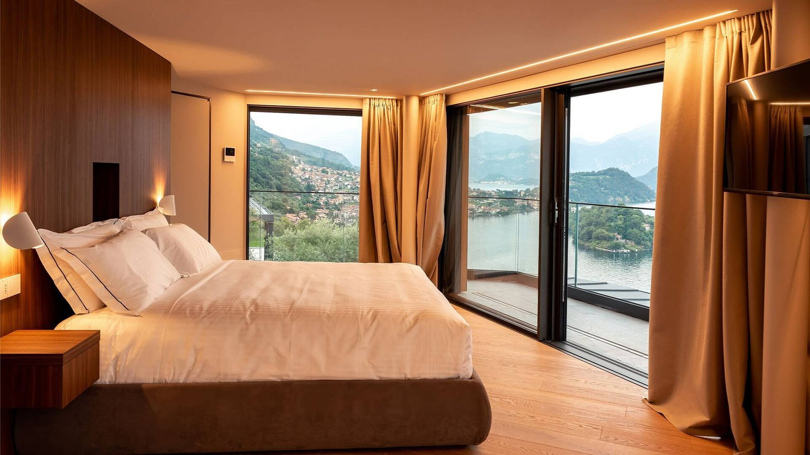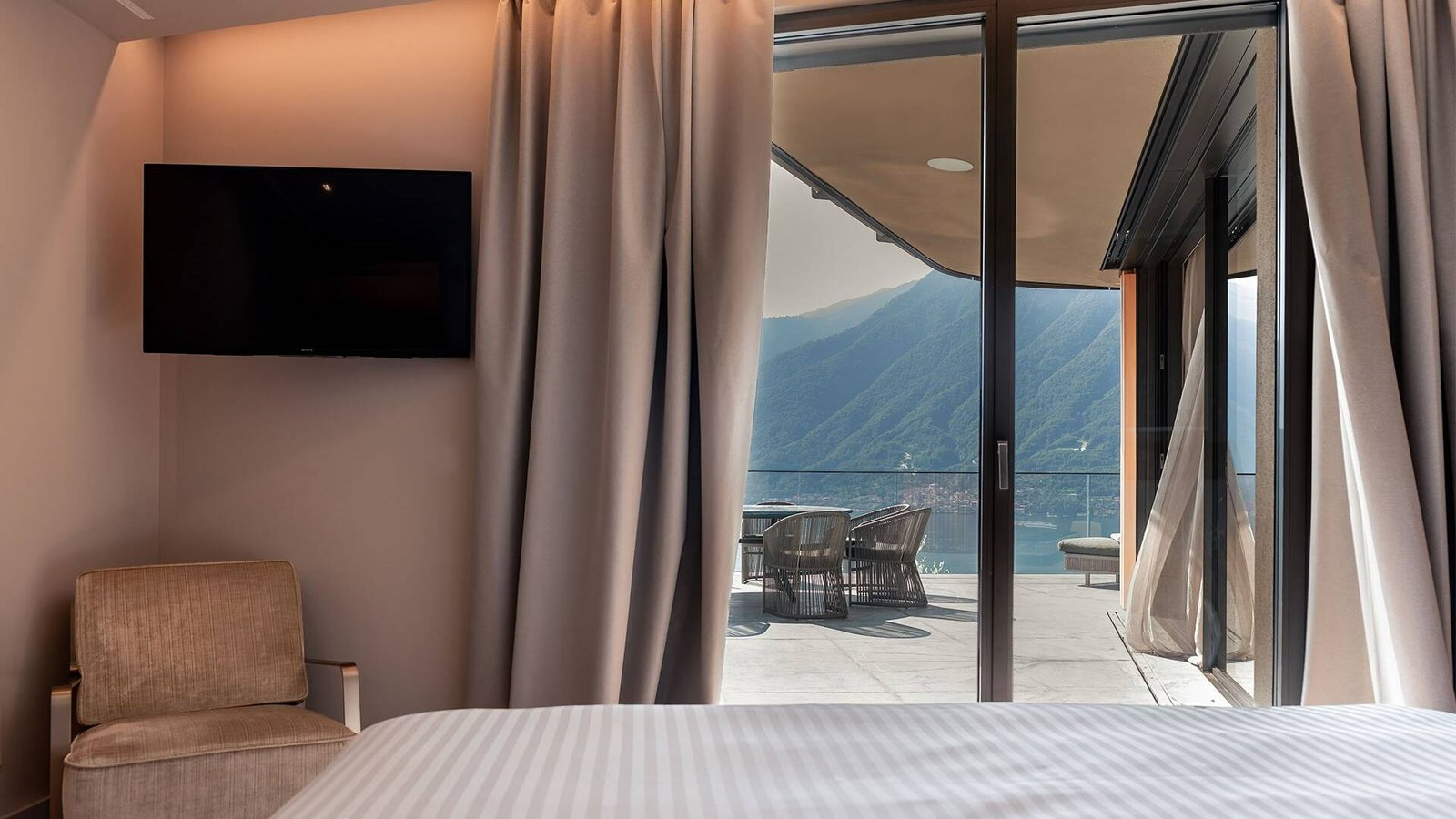 bedroom 4 master bedroom (not convertible into a twin, bed size 180x200cm, 71x79inch) with TV and direct access to private terrace with lake view, en suite bathroom with walk-in shower (plus extra handheld shower).