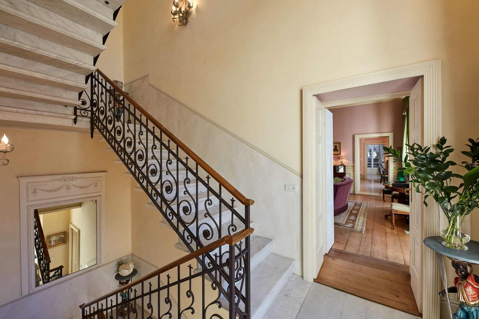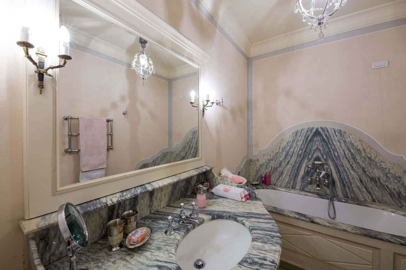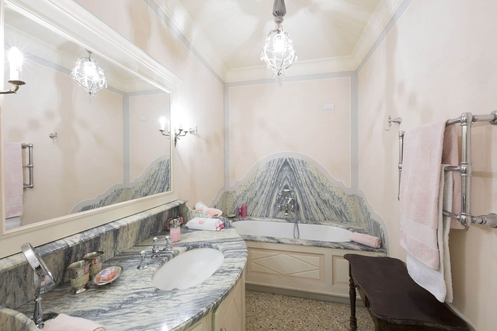 Guests are also met with art nouveau-style furniture and a generous view of the magnificent lake. The ground floor houses also the well-equipped laundry room (washing machine and dryer), one guest’s bathroom, access to the elevator, and a wondrous Carrara marble staircase to the upper floors.